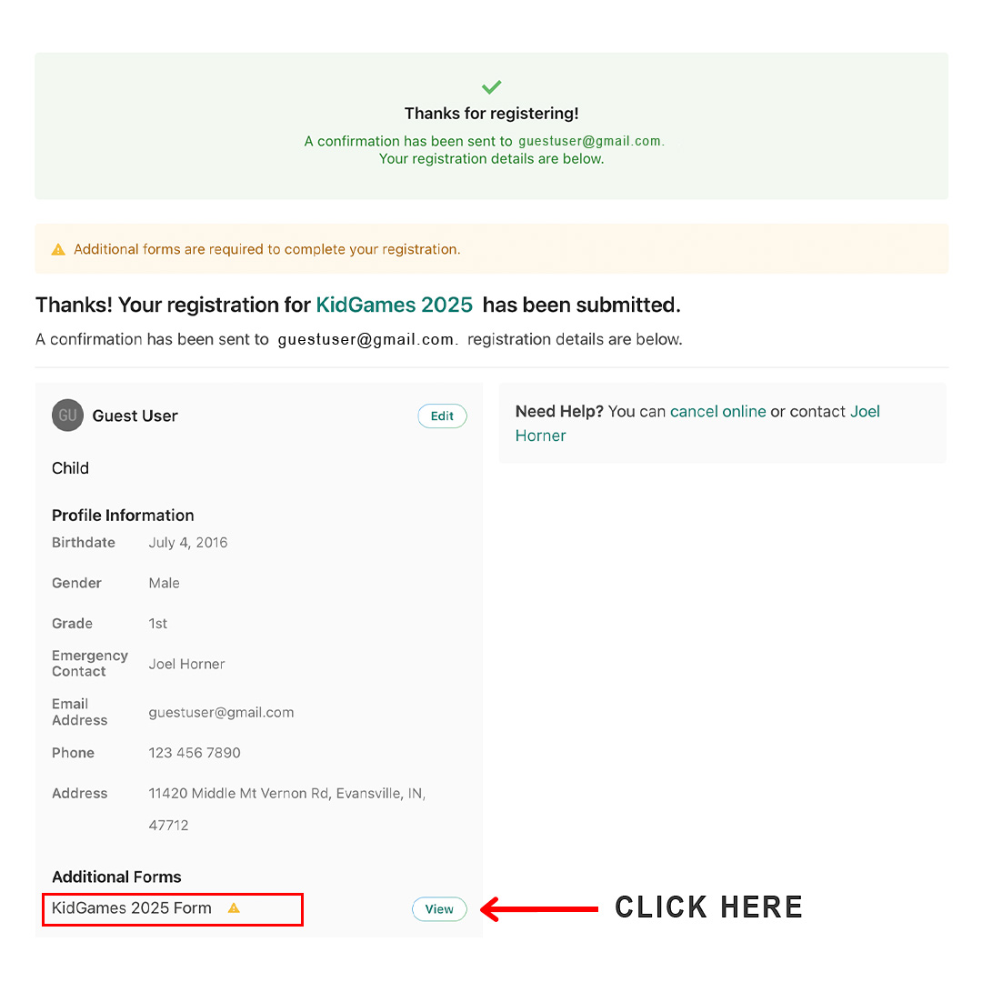 IMPORTANT: After online registration is complete, you will see a confirmation page like the one below. Additionally, please click on and fill out the online "KidGames 2025 Form" that is attached before your child's first night at KidGames 2025. You can still register your child and fill out this form even if you hear about KidGames after it has begun.